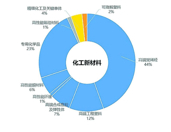 首先,《方案》對傳統產業鏈包含石油化工、煤化工、鹽礦化工及生物化工等領域的延鏈產品進行了描述。石油化工產業鏈要重點做好烯烴、芳烴的利用,發展高端聚烯烴、工程塑料、聚氨酯、特種合成橡膠、高性能纖維、功能膜、專用化學品、高性能膠黏劑等八大類產品。這些產品絕大多數屬于化工新材料范疇(高端聚氨酯可劃分至化工新材料的彈性體和專用化學品,高性能膠黏劑可劃分至專用化學品)。此外,煤化工里涉及的可降解塑料、生物化工里涉及的生物基單體、鹽礦化工里涉及的氟硅樹脂和氟硅橡膠等分別屬于化工新材料里的可降解材料、精細化工及其單體,以及高性能氟硅材料領域。因此,《方案》中提到的傳統產業鏈向高端化延伸的核心是推動化工新材料的發展。石油化工行業的產業鏈延伸是化工行業轉型升級的重中之重,涉及的化工新材料市場份額占化工新材料總需求(按重量統計)的90%以上。生物化工里的生物基產品是對現有化石基材料的有效補充,是綠色低碳的重要發展方向。